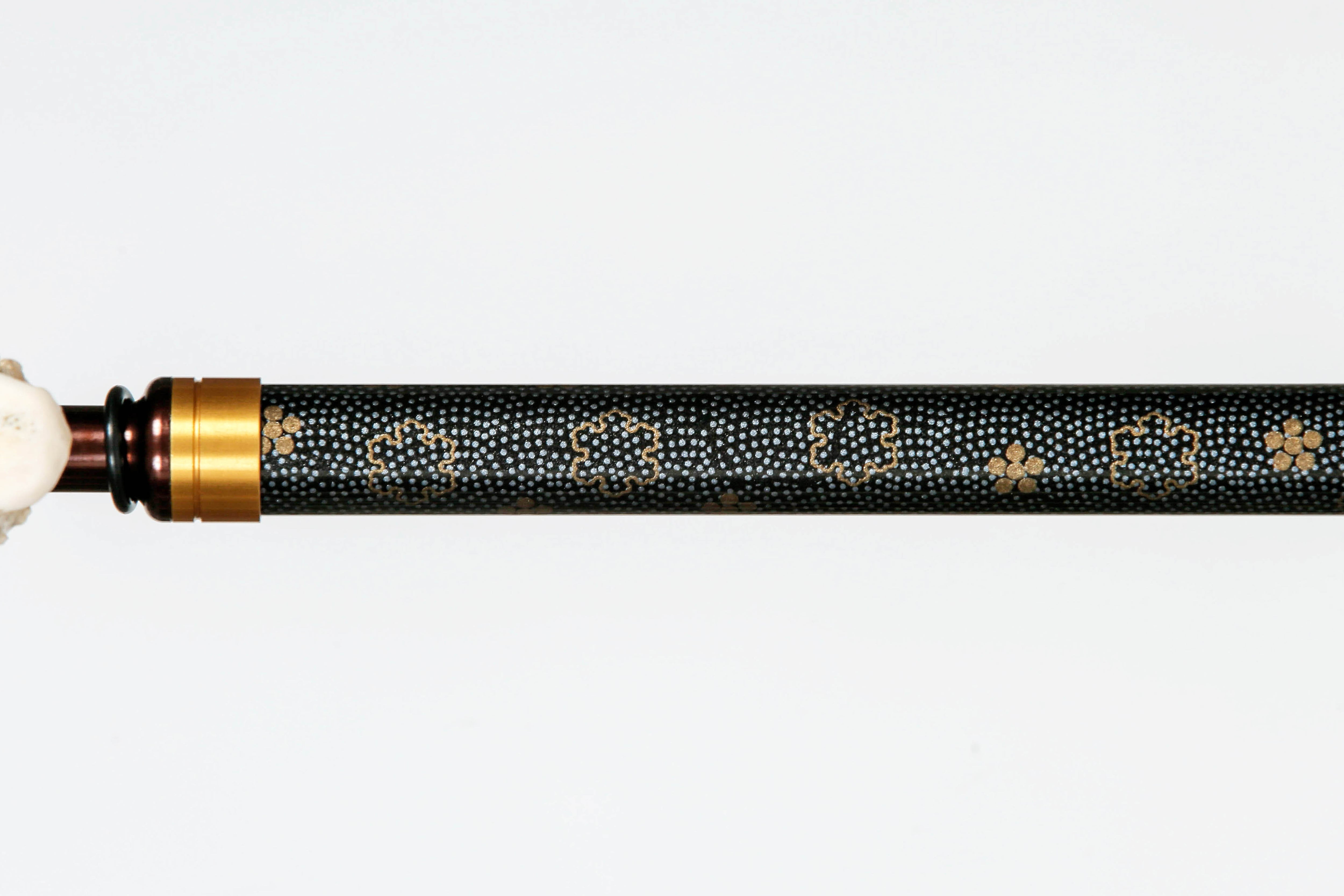 神様のお使いとされる奈良春日の「神鹿」。その雄鹿の角の確かな質感をグリップに、日本伝統の小紋柄をあしらった最高級一本杖です。